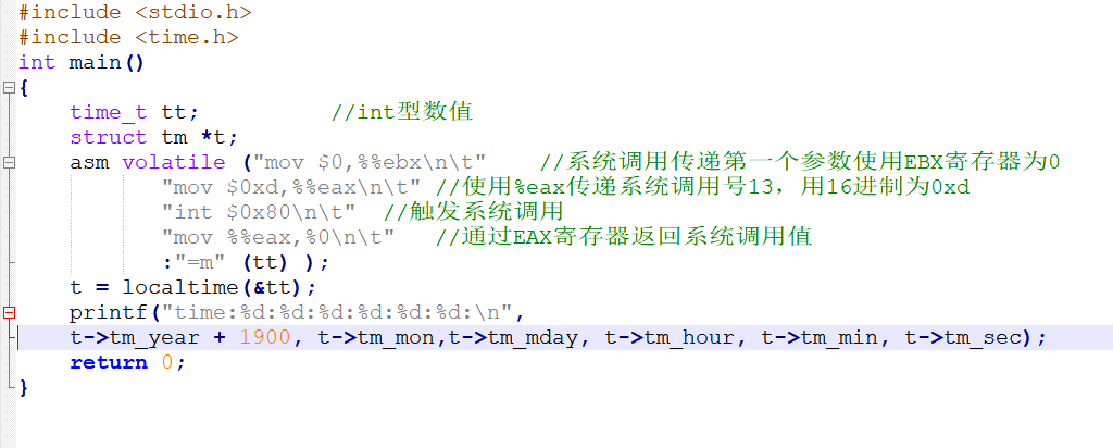通过系统库函数和直接使用嵌入式汇编代码两种方式,来触发同一个系统调用获取当前